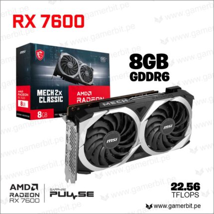 La tarjeta gráfica AMD Radeon RX 7600 es una excelente tarjeta gráfica impulsada por unidades de cómputo AMD RDNA 3 unificadas que permiten un rendimiento ultrarrápido en los principales títulos de eSports y una experiencia de juego fluida en los títulos AAA más nuevos a 1080p.